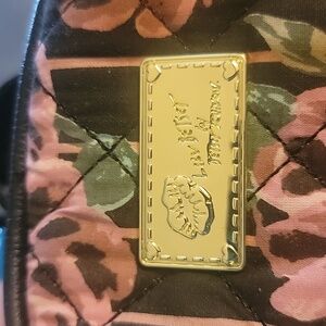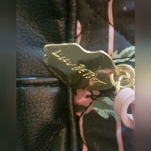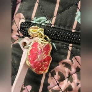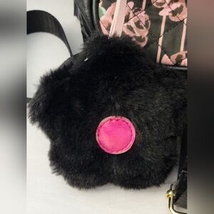 Luv Betsey by Betsey Johnson mini back pack, black base with pink quilted floral print on one side, outside zipper pocket, lip charm and fluffy flower charm, inside one open compartment, adjustable straps, style and practicality for everyday use, small, compact, back to school, vacation, travel, weekend getaways