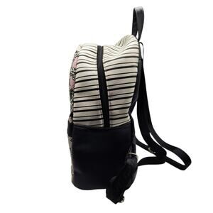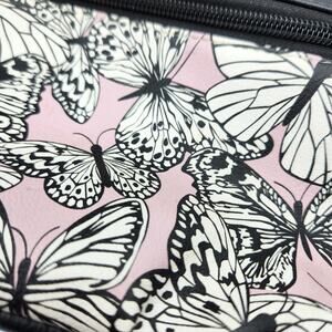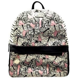 This Betsey Johnson backpack is bold, playful, and full of personality. The soft pink background is covered in black and white butterflies, with striped accents and a silver butterfly zipper pull that ties it all together. It’s compact but roomy, perfect for daily essentials or a statement accessory.