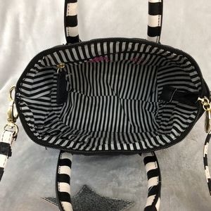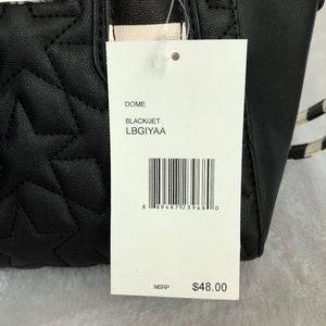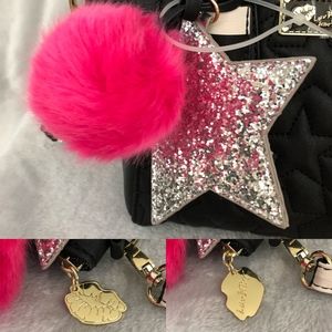 Star-quilted faux leather bag with striped handles and strap. Bag is adorned with a silver star and bright pink puff. Bag measures approx 7.5”x4.5” at the base and 10.25” wide at the top. Bag is approx 7” tall (not including the handles). Rolled handles drop approx 3.5” and long strap drops approx 23.5”. Long strap is removable. Star glitter can come loose. Interior has one zippered pocket and a slip pocket with 3 pen slots. Bag is new, never used. Bag is white/black, sun caused some yellow hue.