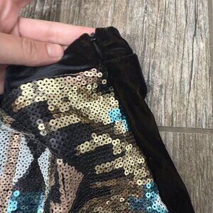 Fun festival shorts by Luxe Muse. No size tag, fits XS or even XXS. Shine in style with these high-waisted sequin shorts. Featuring a striking black and gold pattern, these shorts are perfect for a night out. Comfortable and chic, they add a touch of glamour to any outfit.