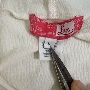 Stay cozy and stylish in this Lux white hoodie dress, size Large. Perfect for layering or wearing solo, this dress features a wrap-style front, a functional hood with drawstrings, and front patch pockets for practicality.