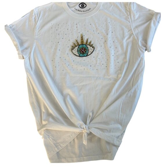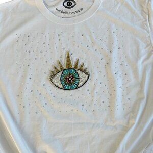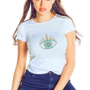 Lux Sequins Crystal Evil Eye Oversized T-Shirt Tie Front Women's VS