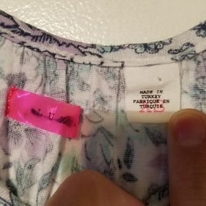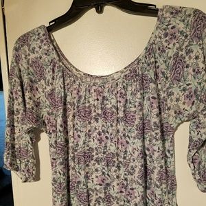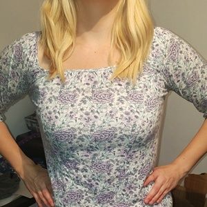 Beautiful purple and blue floral printed tunic, 3/4 length sleeves, 100% viscose, extremely soft and stretchy, size XS but loose and flowy, sold at Urban Outfitters