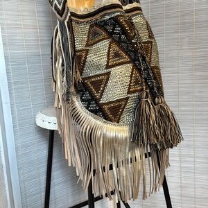 Embellished with glass crystal and leather fringe.