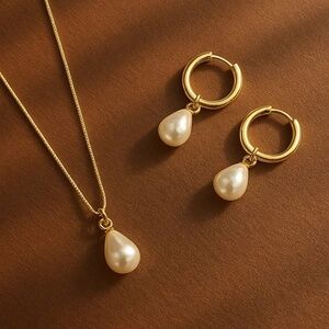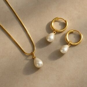Luxe 18k Gold Plated Stainless Steel Faux Pearl Earrings Necklace Set