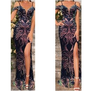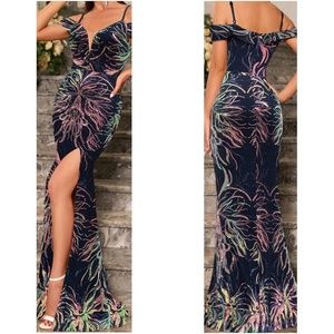 Luxe Baby Blue Sequin Cold Shoulder Party Evening Wedding Prom Dress