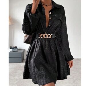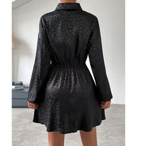 Luxe Black Leopard Print Satin Button Stretchy Waist Long Sleeve Dress