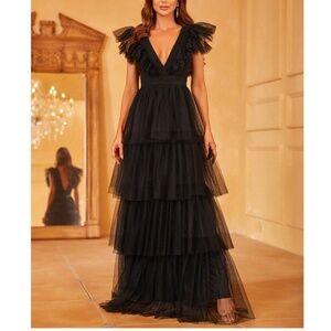 Luxe Black Plunging Neck Ruffle Sleeve Evening Party Formal Dress