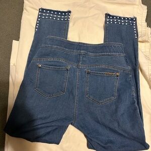 Luxe Denim 4 way stretch ankle jeans with little white beads around ankles.