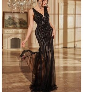 Luxe V neck Sequin Mermaid Hem Fitted Party Evening Wedding Dress