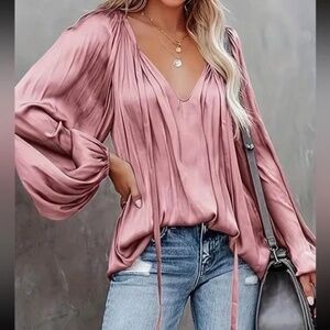 Luxe Satin Neck Tie Lantern Long sleeve Blouse