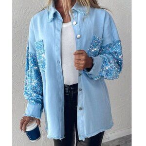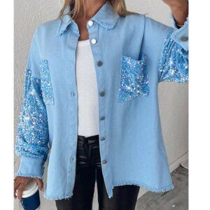 Luxe Sequin Button Down Frayed Detail Jacket Shacket