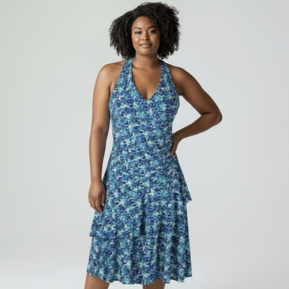 Luxe by Carmen Marc Valvo blue/green Print Sleeveless criss cross Dress sz 14W This garment has no flaws. you will be pleased