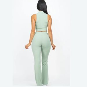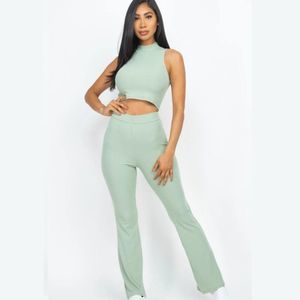 - 2 piece set comes with a tailored sleeveless mock turtle-neck crop top and high wasted baby-flare bottoms.