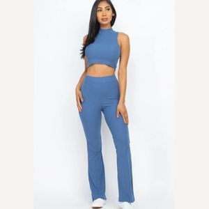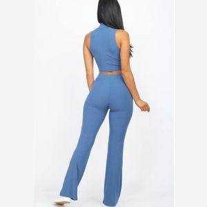 - 2 piece set comes with a tailored sleeveless mock turtle-neck crop top and high wasted baby-flare bottoms.