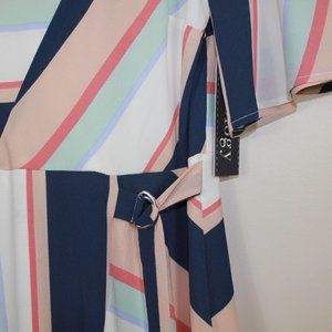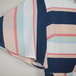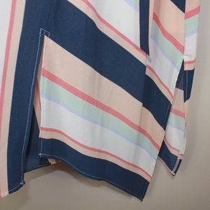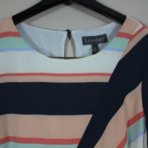 Navy, peach, green, white striped asymetrical midi dress made by Luxology. It is brand new with tags! It is a women's size Small. Lightweight flowy material with a thicker lining layer underneath. Belt accent at the side. Button keyhole in the back with zipper closure below. Fabric is made from 97% polyester and 3% spandex with 100% polyester lining. Measures 44.5" long at the shorter side (left), 17.5" across the chest and sleeves measures 12 1/4" long. So pretty!