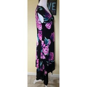 The Luxology Black Fuchsia Sleeveless Floral Shark Bite Women's Dress in size 10 is a stylish and versatile piece perfect for various occasions. Featuring a beautiful floral pattern, flattering V-neckline, and pullover closure, this knee-length dress is made from polyester knit fabric for comfort and durability.