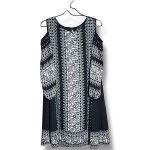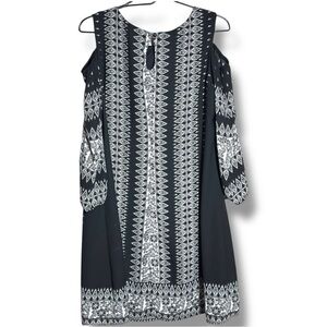 Luxology Black and White Vertical Geometric Pattern Shoulder Cutout Mini Dress