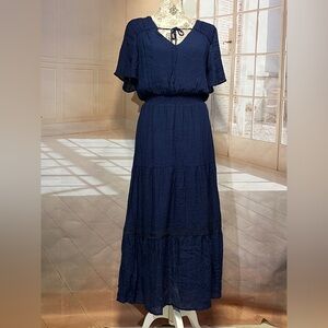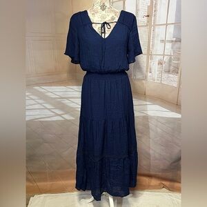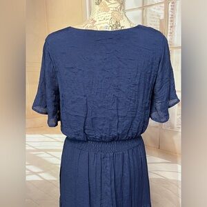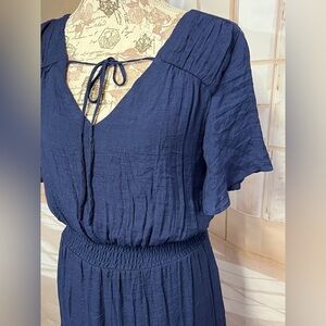 Navy blue flutter sleeve maxi dress from LUXOLOGY, size M. Dress has tie neck, elastic waist and full lined skirt.