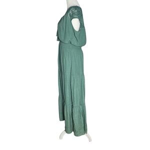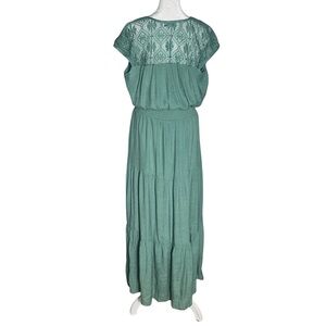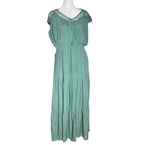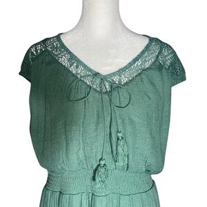 Luxology Green Lace Trim Boho Maxi Dress Size L Smocked Waist Tassel Tie