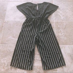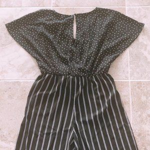 LUXOLOGY POLKA DOT STRIPED TIE FRONT WIDE LEG CROPPED JUMPSUIT IN BLACK & WHITE