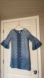 A back keyhole cutout neck opening closed by a beautiful blue shiny button. Distressed blue w fading goes to a darker blue shade at ends.
