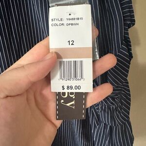 Simple long sleeve dress with navy and white stripes. Features ruffle details on sleeves. Perfect for any occasion.