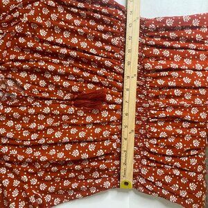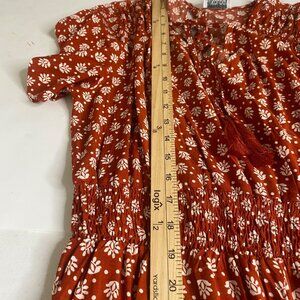 Lightweight rayon fabric with floral print, short sleeves, elastic waist, and tassel tie neckline. Ideal for casual wear or gatherings.
