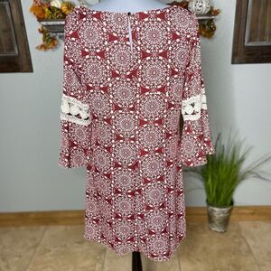 Luxology Red Cream Floral Mosaic 60’s Vibe Groovy Hippie Shift Dress Size 8