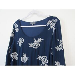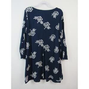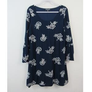 Luxology XL Blue Dress White Embroidered Flowers Scoop Neck Long Bell Sleeves