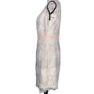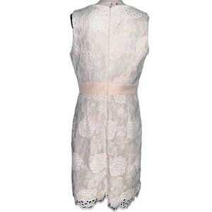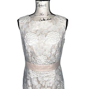 This Luxology blush pink lace dress is a beautiful addition to any wardrobe! It is in excellent used condition and comes from a smoke-free home. The dress is made of 86% cotton and 14% other fibers. The contrast and lining are 100% polyester. This size 10 dress will surely turn heads!