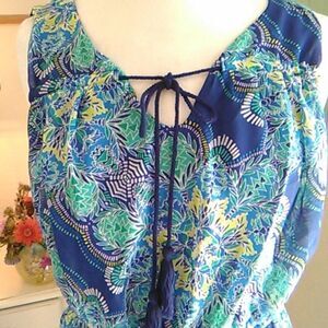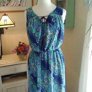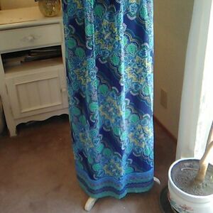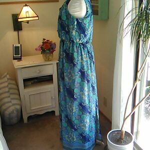Pretty maxi with a floral graphic the falls diagonally across the skirt to a border print. Fully lined. Elastic waist. Lace ties in front. Ties come from the arm hole and can gather the chest a little if you like. Size L measures 44 at chest, 30-44 at waist. Topics blouson. Lining at 46 at hips. 55 long from shoulder to hem. Cool colors for hot weather.