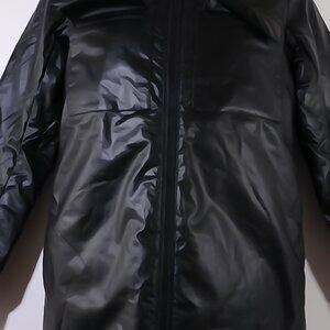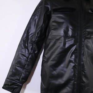 Neat peaked face framing collar. Smooth satin shell finished in lightweight recycled polyester. Ultimate lightweight bomber jacket.