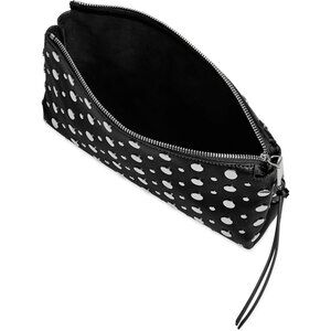 Features: Compact and sleek, made from soft black nappa polyurethane. Adorned with shiny silver studs for a rebellious touch. Designed to hold just the essentials, with a zip closure and a signature fringe pull detail that adds a bit of flair.