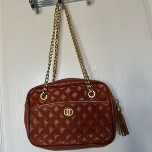 This elegant quilted leather shoulder bag features a rich brown hue and gold chain straps, offering a touch of luxury to your ensemble. Perfect for any occasion.