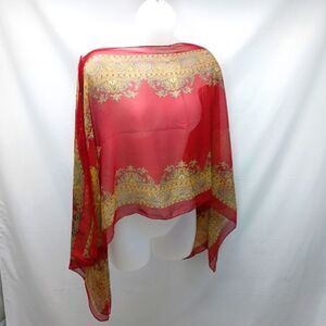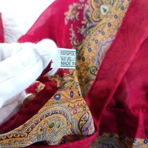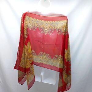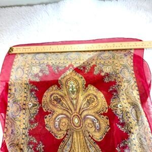 This exquisite scarf features a vibrant red hue adorned with elegant gold metallic patterns, creating a striking contrast. Its lightweight and semi-transparent fabric drapes beautifully, making it a perfect accessory for both casual and formal occasions.