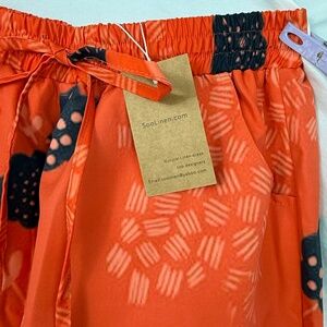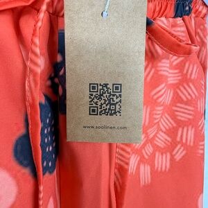 These luxurious NWT SooLinen pants feel so soft against the skin. They are made out of coated linen which requires hand wash with gentle detergents and no fabric softener. With a relaxed fit and wide leg, these are perfect to everyday wear. The waist has an elastic waist band as well as a drawstring in the same material as the pants. Approximate measurements: Waist: 13"; Length: 37"; Waist to Crotch: 14.5"; leg width at ankle: 12".