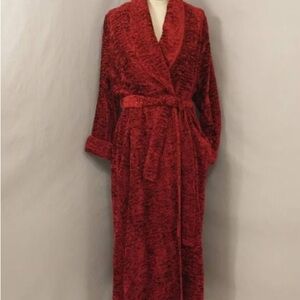 Elegant red robe with a plush texture. Features a wrap-around belt and cozy design.
