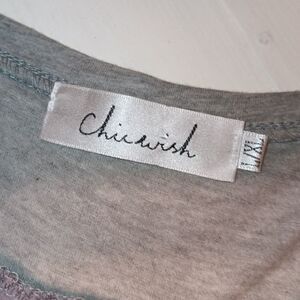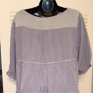 this is a beautiful luxurious top the front portion is a heather gray almost a cotton t-shirt material and then the rest of the shirt where all the ruffles and the flow comes from is so soft and it feels and it looks like silk raw silk! the size is a large / extra large but because of the layers of ruffle definitely will fit an extra large with a little extra room,armpit measurements are in the photos.