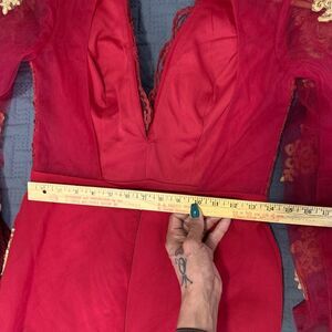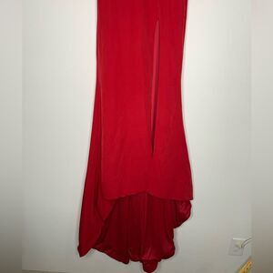 Make a statement with this luxurious red gown featuring elegant gold accents. Perfect for evening events.