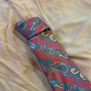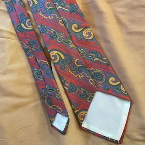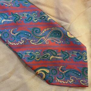 No tags, but the feel of silk is unmistakable on this neck tie. Paisley striped in red, blue, green and gold. Excellent condition. 4” at widest part and 57” long