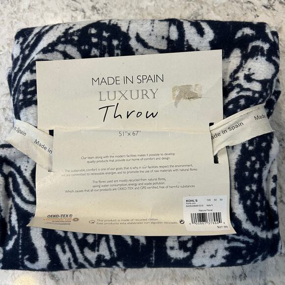 Luxury 51”x 67” Throw Blanket- Made In Spain, recycled cotton blue white navy