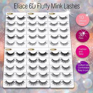 I'm selling a plush set of fluffy 6D Mink Lashes, offering you a full array of 10 different stylish looks with 30 identical pairs in each pack. These lashes are handcrafted from premium mink fiber, designed for multiple uses (up to 18 applications per pair) with gentle care. They come in varied lengths from 14-17mm to suit any eye shape. Comfort is key; these lashes are super soft, lightweight ( only 0.004g per pair), with a fine 0.07mm thickness, easy even for beginners to apply and remove, thanks to their thin, flexible cotton band. These lashes are ideal for any event, whether it's a party, wedding, date night, or everyday wear. They'll enhance your eyes, making them appear larger, brighter, and utterly captivating. Whether you wish to effortlessly transition from day to night looks or simply boost your natural beauty, these lashes are your go-to accessory. Indulge in the luxury of professional-grade lashes that are 100% cruelty-free and will keep you looking stunning anytime, anywhere.