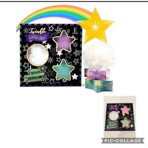 Star Bath Gift Set Includes: 75g Lavender Vanilla Essential Oil (Purple), 75g Eucalyptus Essential Oil (Green), 1 Bath Pouf (White)