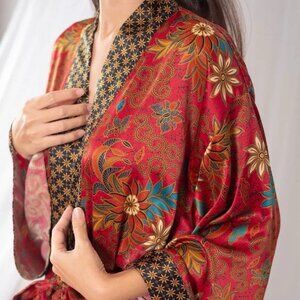 Elevate your wardrobe with this luxurious Batik silk blend kimono robe for women. Crafted from a premium viscose-silk blend sourced from Indonesia, it offers a soft, breathable, and lightweight feel. The elegant floral design merges traditional artistry with modern comfort, perfect for bridal prep, lounging, maternity shoots, festivals, or as a chic beach cover-up. Featuring a removable waist belt, deep side pockets, inner ties, and side slits, it provides both beauty and function. The robe is machine washable, quick-drying, wrinkle-resistant, and designed to retain its vibrant color. One size fits most (S–M–L) with a flattering knee length. New with tag.