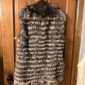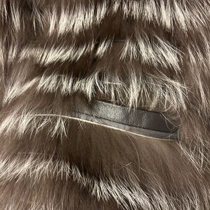 Exquisite silver fox vest with leather edged pockets and front hook and eye closures. This vest is 20.5” armpit to armpit; 39.5” shoulder to hem.