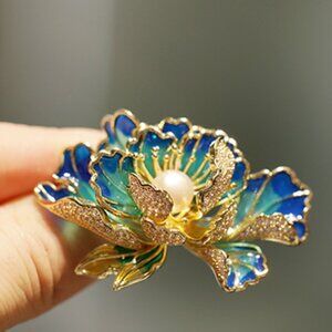This magnificent Peony flower brooch is a luxurious and artistic statement piece. The large, layered petals feature striking, hand-painted Blue and Teal Enamel work that gives the flower a beautiful, life-like depth.