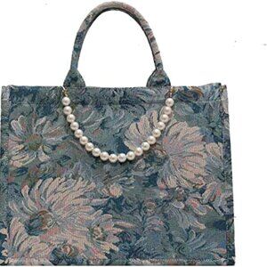 Features: This chic tote combines durable cotton and linen with intricate jacquard embroidery. The large size makes it perfect for daily errands, work, or travel, keeping everything you need within reach. The removable pearl chain adds a touch of elegance, and the secure zipper closure keeps your belongings safe. Includes a small zippered inner pocket for valuables.