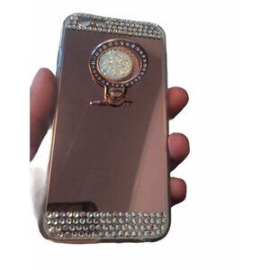 This rose gold phone case combines elegance and functionality with its crystal rhinestone accents, mirror finish, and secure ring holder for optimal grip.