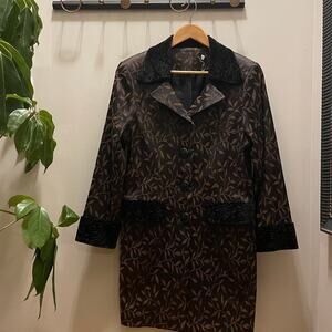 Exude elegance and sophistication with this designer-inspired black satin coat, featuring an intricate embroidered leaf pattern, luxurious velvet-trimmed details, and large front pockets. The tailored silhouette and high-end aesthetic make this coat a timeless statement piece for evening wear, formal occasions, or upscale layering.